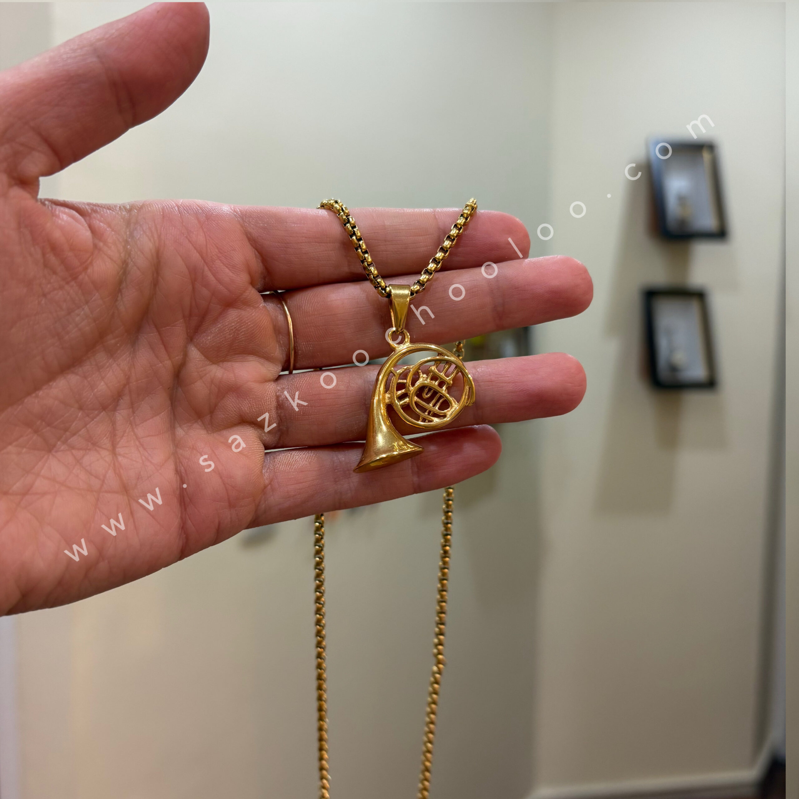 گردنبند هورن جنس استیل،رنگ طلایی،وزن 23 گرم،ابعاد 2.5*4 سانت و ابعاد زنجیر 60 سانت.